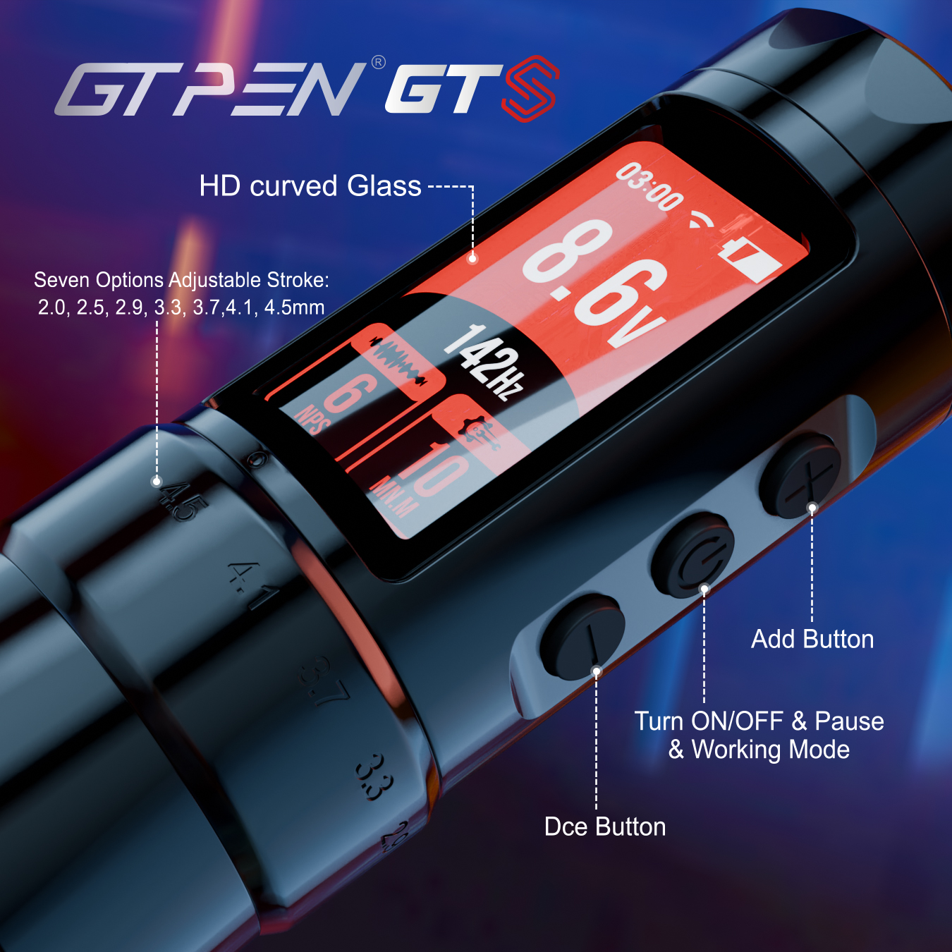 The GTS Wireless Pen with Adjustable Stroke is a premium, aviation-grade wireless tattoo machine engineered for precision, versatility, and professional performance. Featuring a fully adjustable 2.0–4.5 mm stroke (7 gear options), an HD curved display, replaceable 18500 battery, Bluetooth foot pedal connectivity, and SMP-specific performance modes, this machine is built to adapt to every style—from scalp micropigmentation to detailed linework and shading. Its fully detachable design, CNC-machined components, and seamless adjustable grip ensure a smooth, powerful, and reliable experience in every session.