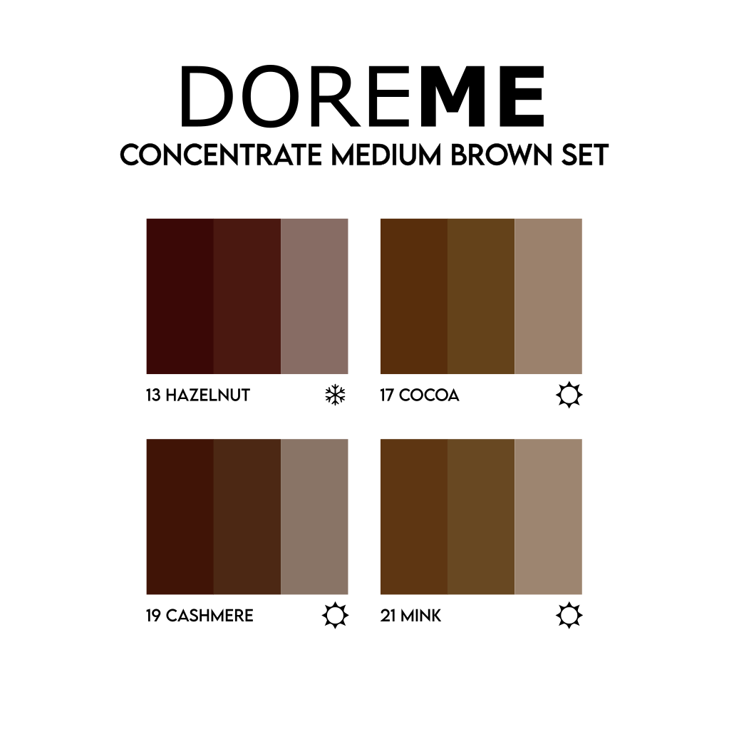 The Doreme Concentrate Dark Brown Set comes with 4 of our most popular medium brown colors. A mixture of Warm and Cool Tones, from a medium dark brown tone to earthy medium brown tones, you can mix and match to satisfy your client’s desired color. This set includes: