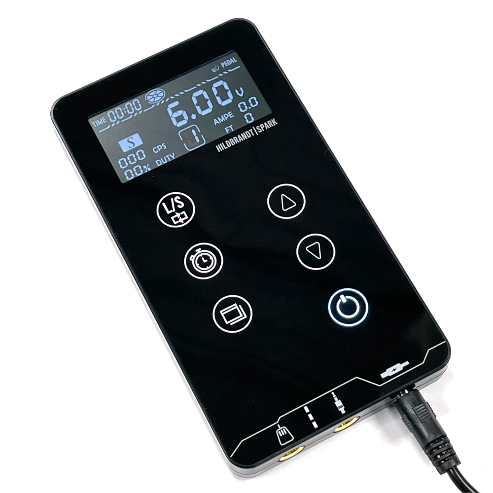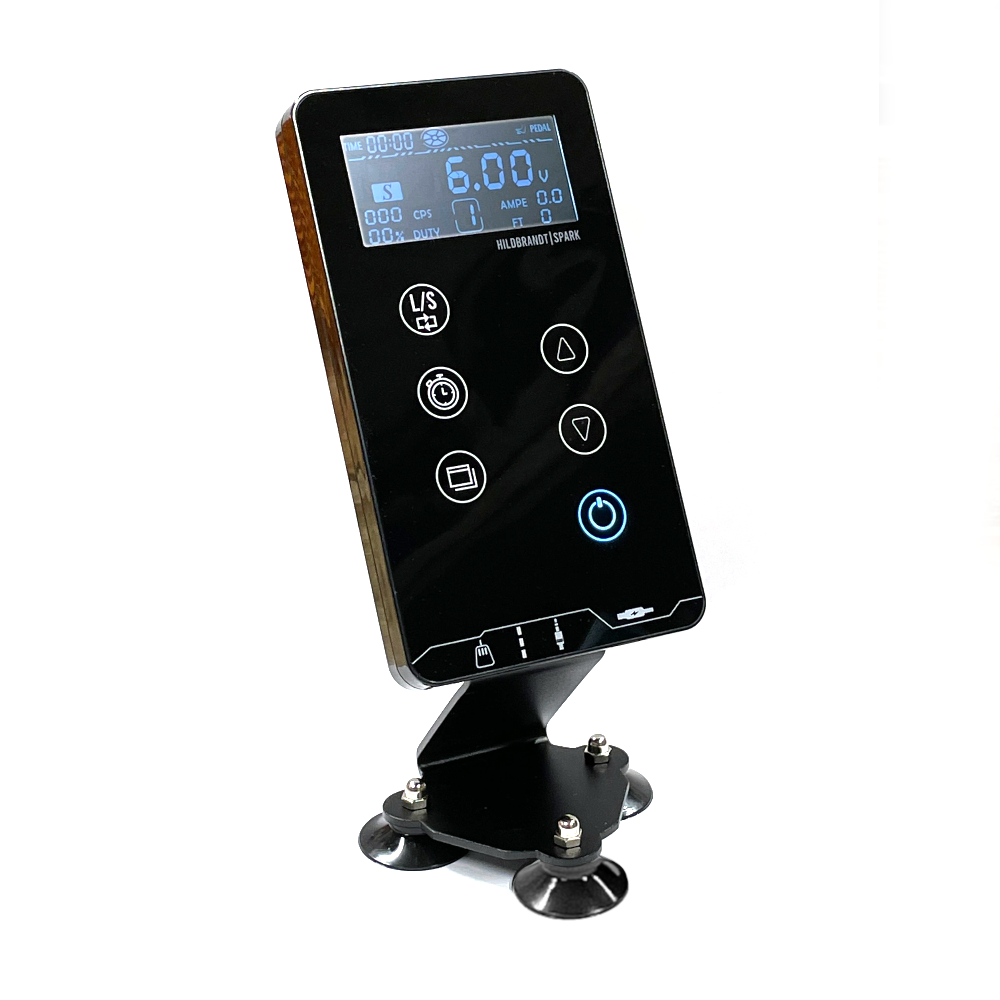 Are you ready for a jolt of excitement? The Hildbrandt Spark is here to electrify your tattoo machines with the power of a kajillion thunderbolts! (actual output may be significantly less than a kajillion thunderbolts). The Spark has an output voltage range of 3-18v, output power of 0.3 to 68W, output current of 0-3A with built-in overload protection to protect your machine and the power unit. This device has 6 liner and shader preset modes that you can configure for different machines, settings specific for certain needle sizes, mode specific for BG/shading/packing, and the works! Are your feet getting tired? Press the automatic button to switch between foot pedal control or continuous run! Need to keep track of sessions? Built-in session timer! Are you a stickler for numbers and min/maxing your machine? Analyze all you want via the duty, cycle, and follow-through readouts. The Spark measures 3 1/4″ x 6″ and will fit a standard size wash bottle bag, so bagging has never been easier! The unit comes with a solid metal stand with the option of rubber suction feet to stick onto glass or polished surfaces or magnetic feet to stick onto magnetic surfaces. Weighing in at less than 6oz!